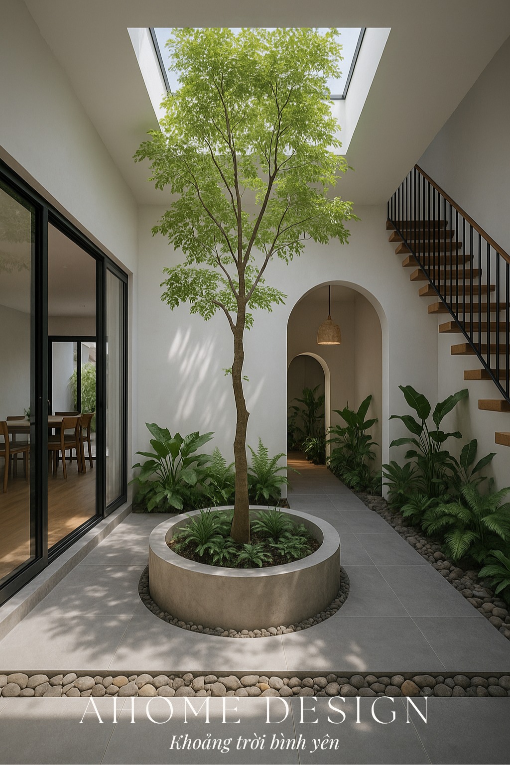 Giếng trời là giải pháp lấy sáng nhà phố được ứng dụng rộng rãi, đặc biệt với nhà ống. Giếng trời giúp ánh sáng lan tỏa đều từ trên xuống, đồng thời hỗ trợ thông gió tự nhiên.
